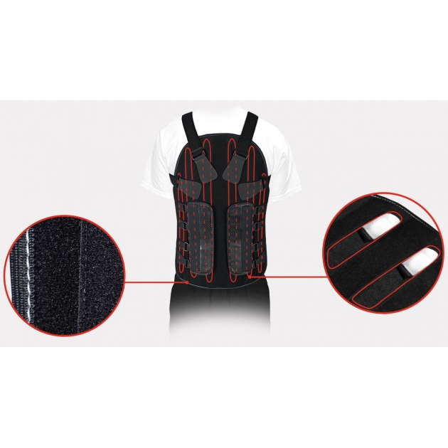 Gorset zapewnia full-obwodowe sztywne wsparcie kręgosłupa, od odcinka piersiowego (rejon łopatek T2/T3) w dół, aż do odcinka krzyżowego (S1).