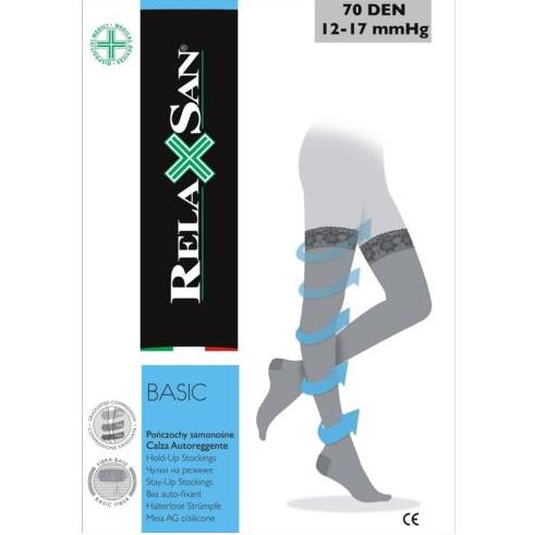 Pończochy samonośne przeciwżylakowe uciskowe z dzianiny 70 DEN o stopniowanym ucisku. Ucisk w kostce 12-17 mmHg – ucisk lekki.