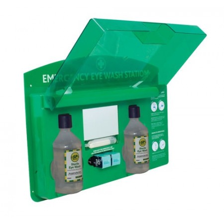 Stacja do montażu na ścianie zawiera 2x500 ml NACL 0,9 % do płukania oka, lusterko i instrukcja przemywania oczu. Nadaje się szczególnie do miejsc produkcyjnych gdzie występuje duża ilość brudu i kurzu oraz przy mobilnych stanowiskach pracy.