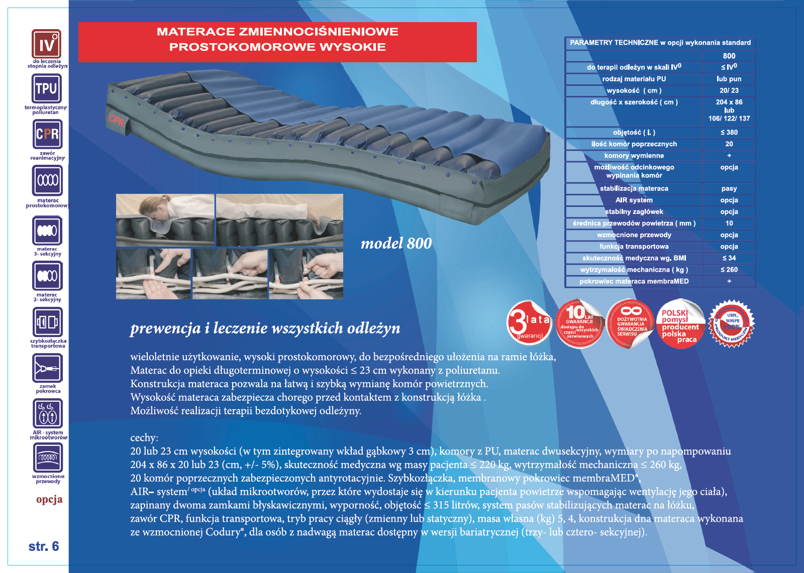 materac prostokomorowy model 800: materac zmiennociśnieniowy do opieki długoterminowej. Wysoki o budowie prostokomorowej, posiada wymienne elementy. Wymiary 195 x 85 x 20 cm, 20 komór poprzecznych o przekroju prostokątnym z podwójnym zabezpieczeniem antyrotacyjnym. Wykonany z poliuretanu, komory wymienne, membranowy pokrowiec membraMED®, zapinany zamkiem błyskawicznym, system pasów stabilizujących, szybkozłączka transportowa, zawór CPR. Działanie profilaktyczne i lecznicze dzięki najlepszym właściwościom redukcji siły ucisku, chłodzącym i mechanoterapeutycznym (masaż). Konstrukcja materaca pozwala na łatwą i szybką wymianę pojedynczych komór w przypadku ich uszkodzenia. Materac należy układać bezpośrednio na konstrukcji łóżka.