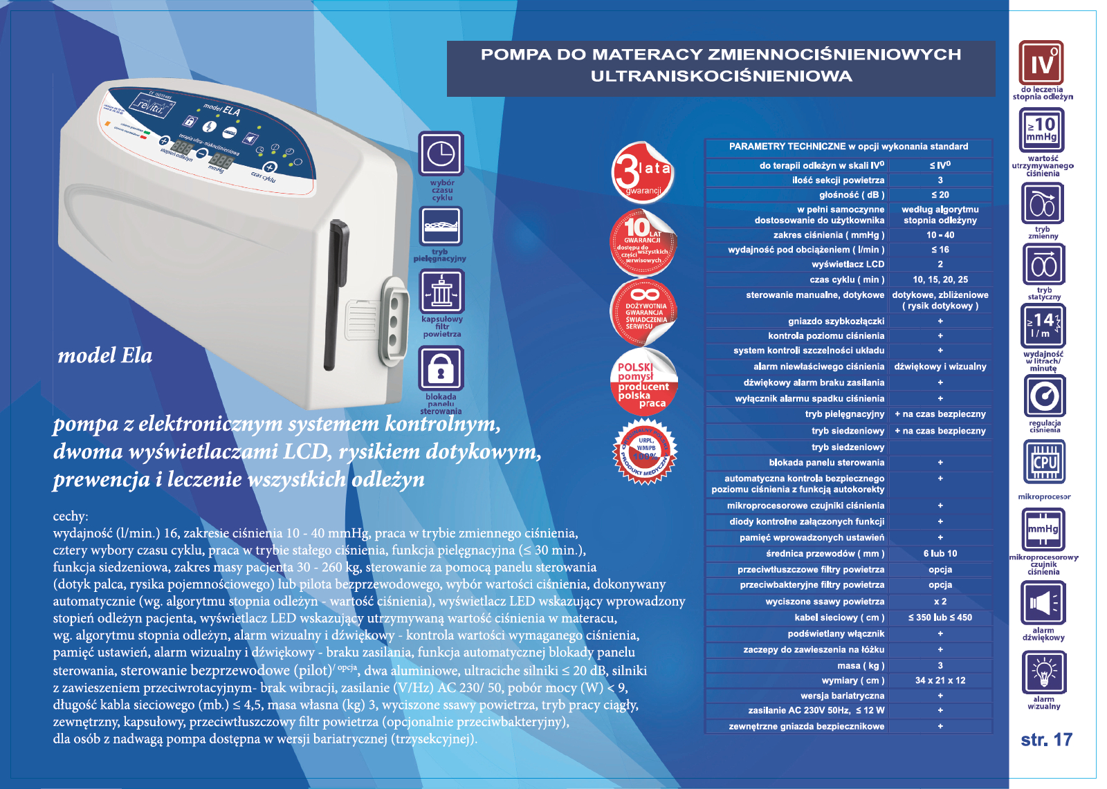 Pompa model Ela, ultraniskociśnieniowa, dwusilnikowa pompa z systemem kontroli ciśnienia, dwa wyświetlacze LED, pompa 3- sekcyjna, z elektronicznym systemem kontrolnym. Pompa dwusilnikowa. Panel sterujący, wraz z sygnalizacją wskazującą niewłaściwą pracę pompy. Sterowanie za pomocą panelu sterowania (dotyk palca, rysika pojemnościowego) lub pilota bezprzewodowego. Zakres ciśnienia 10- 40 mmHg. wydajność 14 l/min. Pompa posiada wybór wartości ciśnienia, dokonywany automatycznie (wg. algorytmu masa ciała – wartość ciśnienia), wyświetlacz LED wskazujący podany stopień odleżyn, drugi aktualnie utrzymywaną wartość ciśnienia w materacu. Pompa posiada funkcję automatycznej blokady panelu sterowania, która chroni pacjenta przed przypadkowym wprowadzeniem zmian ustawień lub przez osoby nieuprawnione. Nastawy i regulacje oraz zmiany wartości ciśnienia dokonujemy na panelu dotykowym sterowania pompy. Funkcja wyboru czasu cyklu: 10, 15, 20, 25 minut, funkcja trybu statycznego. Automatyczne tryby: pielęgnacyjny, siedzeniowy. Elektronicznym system kontroli prawidłowego ciśnienia. Alarm braku zasilania. Wyciszone ssawy powietrza, dwa aluminiowe, bardzo ciche silniki ≤ 20 dB, z zawieszeniem przeciwrotacyjnym – brak wibracji, zaczepy do zawieszenia na łóżku. Zakres masy pacjenta ≤ 260 kg.