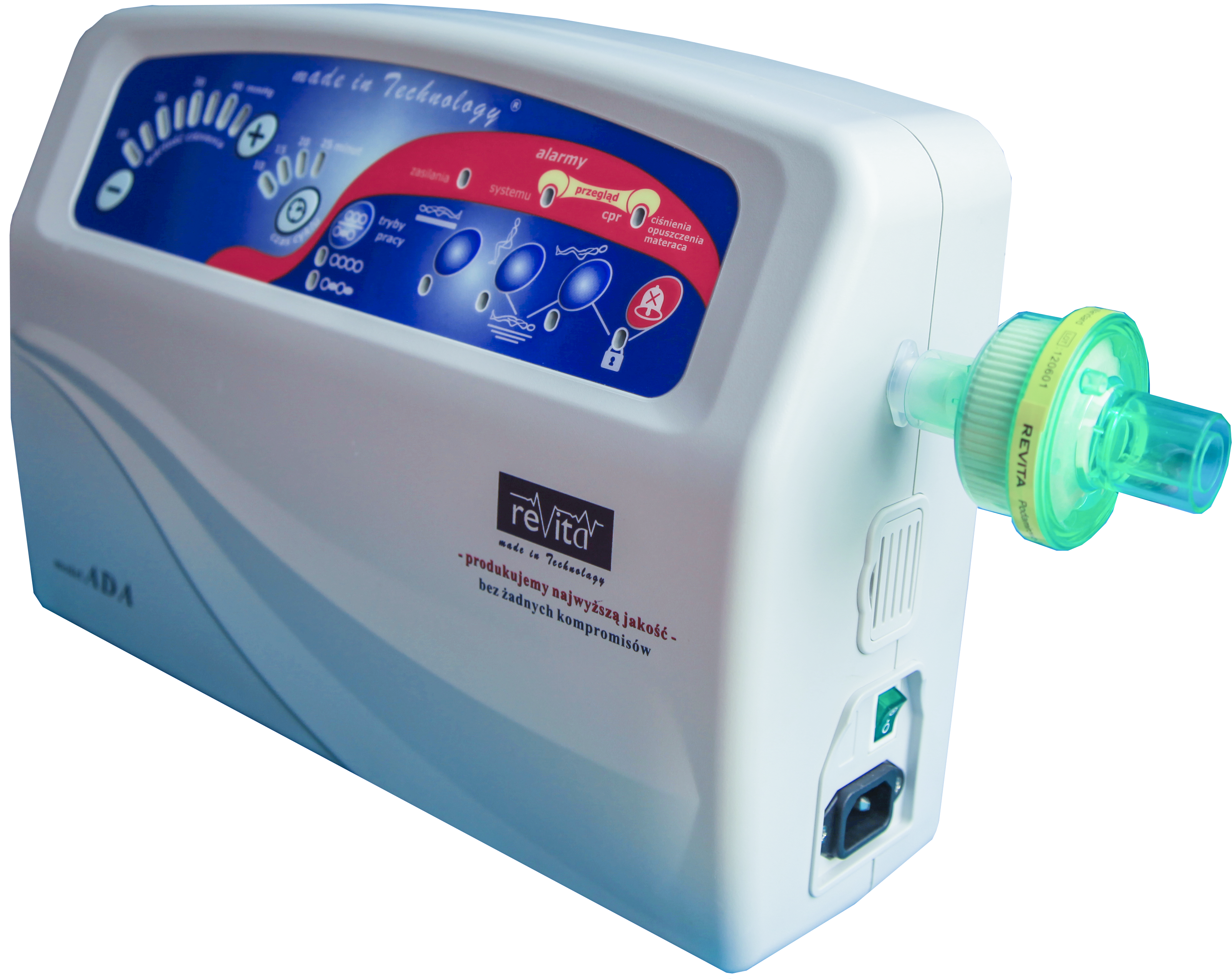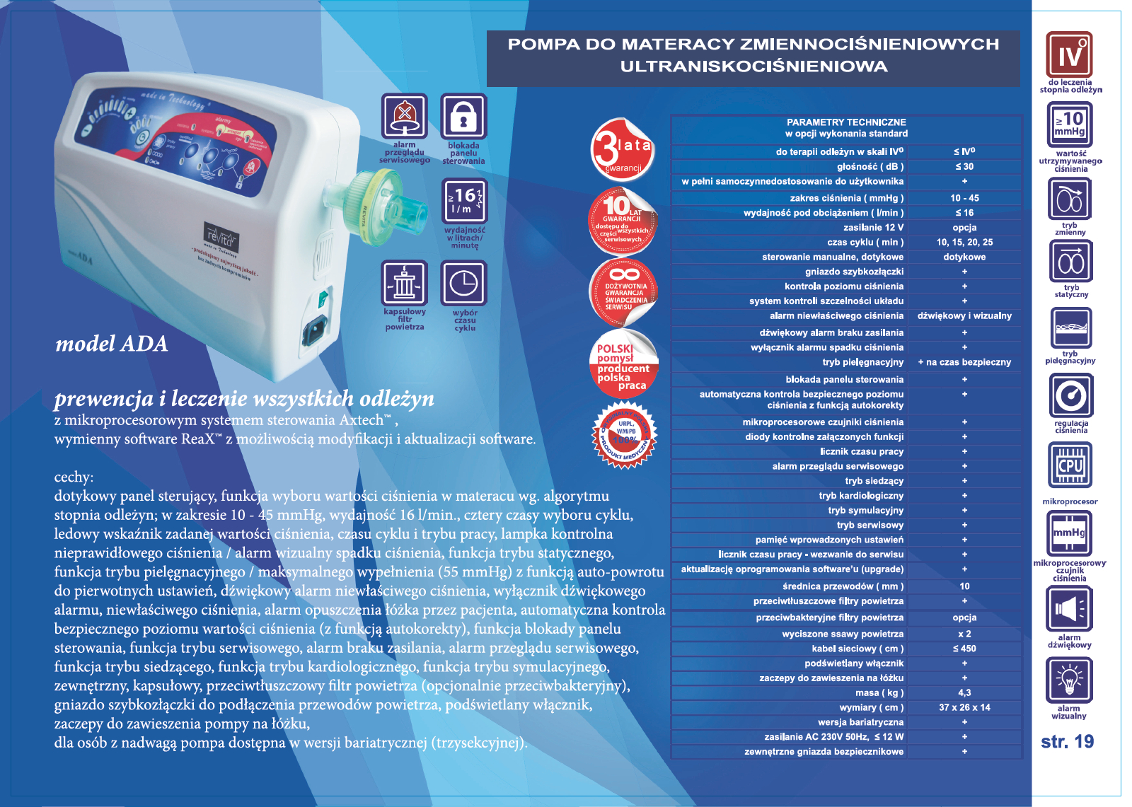 Pompa, model Ada: ultraniskociśnieniowa, dwusilnikowa pompa z mikroprocesorowym systemem sterowania Axtech™ i software ReaX™ z możliwością aktualizacji. Profilaktyka i terapia odleżyn. Pompa dwusekcyjna, dwusilnikowa do współpracy z materacami zmiennociśnieniowymi prostokomorowymi. Panel sterujący, wraz z sygnalizacją wskazującą niewłaściwą pracę pompy. Sterowanie za pomocą panelu sterowania. Zakres ciśnienia 10- 45 mmHg wydajność 18 l/min. Pompa posiada funkcję automatycznej blokady panelu sterowania, która chroni pacjenta przed przypadkowym wprowadzeniem zmian ustawień lub przez osoby nieuprawnione. Nastawy i regulacje oraz zmiany wartości ciśnienia dokonujemy na panelu dotykowym sterowania pompy. Funkcja wyboru czasu cyklu: 10, 15, 20, 25 minut. Funkcja trybu statycznego, pielęgnacyjnego, siedzącego, kardiologicznego, symulacyjnego. Elektroniczny system kontroli prawidłowego ciśnienia. Alarm braku zasilania. Wyciszona ssawa powietrza, bardzo ciche silniki ≤ 34 dB, brak wibracji, zaczepy do zawieszenia na łóżku. Filtr powietrza (przeciwtłuszczowy lub antybakteryjny). Zakres masy pacjenta ≤ 260 kg.