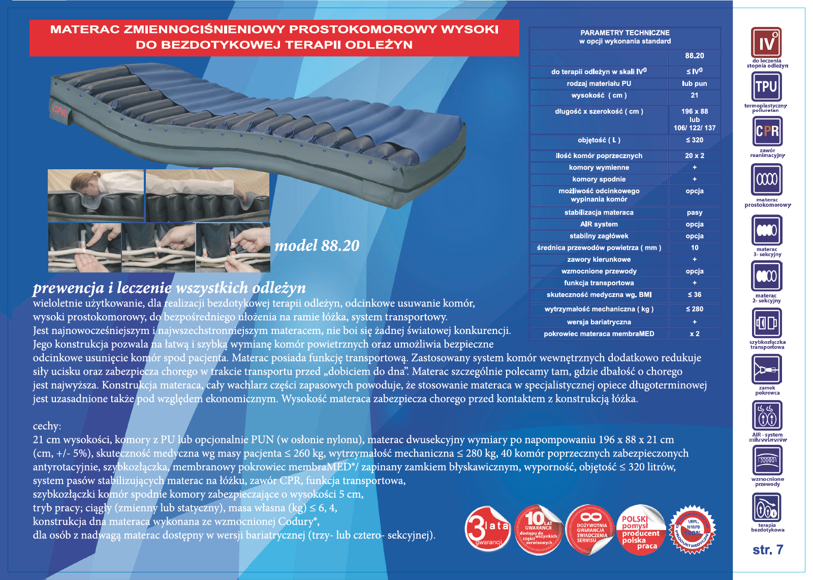 materac, model 88: jest najnowocześniejszym i najwszechstronniejszym materacem. Dwuwarstwowy (system CELL in CELL) materac zmiennociśnieniowy do opieki długoterminowej. Wysoki o budowie prostokomorowej, posiada wymienne elementy. Działanie profilaktyczne i lecznicze dzięki najlepszym właściwościom redukcji siły ucisku, chłodzącym i mechanoterapeutycznym (masaż). Jego konstrukcja pozwala na łatwą i szybką wymianę komór powietrznych oraz umożliwia bezpieczne odcinkowe usunięcie komór spod pacjenta (terapia bezdotykowa odleżyn)/ opcja. Wymiary 202 x 85 x 20 cm, 40 komór poprzecznych o przekroju prostokątnym z podwójnym zabezpieczeniem antyrotacyjnym wykonany z medycznego PU. Zaopatrzony w membranowy pokrowiec membraMED®, zapinany zamkiem błyskawicznym. Materac należy układać bezpośrednio na konstrukcji łóżka, system transportowy. Materac szczególnie polecamy tam, gdzie dbałość o chorego jest najwyższa.