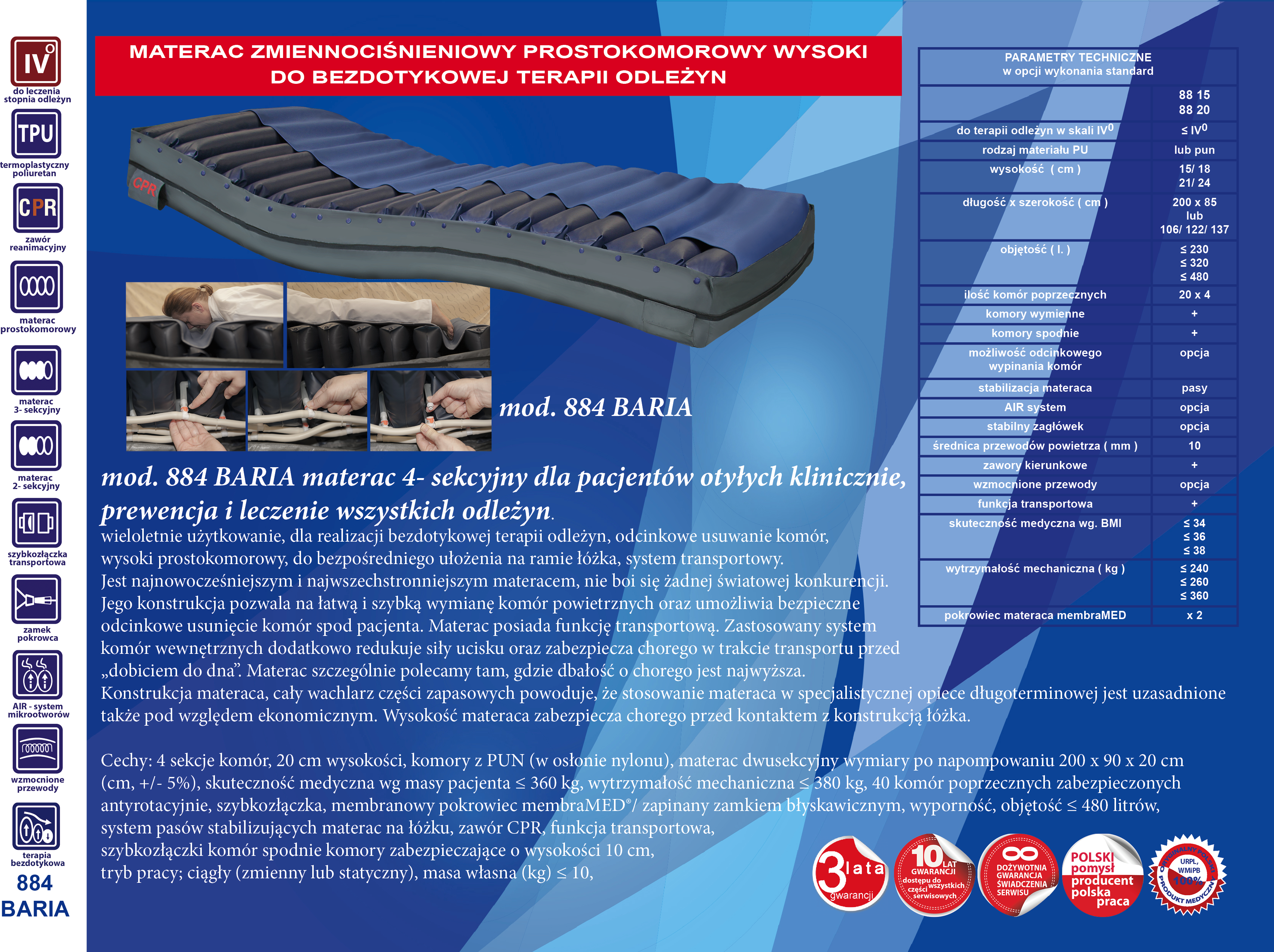 materac, model 884: jest najnowocześniejszym i najwszechstronniejszym materacem. Zasilany jest aż czterema sekcjami powietrza co powoduje, że ciało pacjenta ma stałe podparcie przez min. 75% powierzchni, a dzięki właściwościom pompy Baria ciśnienie wywierane na tkanki miękkie może zostać zredukowane do 10 mmHg. Dwuwarstwowy (system CELL in CELL) materac zmiennociśnieniowy do opieki długoterminowej. Jest to wysoki o budowie prostokomorowej, posiada wymienne elementy. Komory wykonane z PUN. Działanie profilaktyczne i lecznicze dzięki najlepszym właściwościom redukcji siły ucisku, chłodzącym i mechanoterapeutycznym (masaż). Jego konstrukcja pozwala na łatwą i szybką wymianę komór powietrznych oraz umożliwia bezpieczne odcinkowe usunięcie komór spod pacjenta (terapia bezdotykowa odleżyn)/ opcja. Wymiary maksymalne to 202 x 120 x 22 cm, 40 komór poprzecznych o przekroju prostokątnym z podwójnym zabezpieczeniem antyrotacyjnym wykonany z medycznego PU. Zaopatrzony w membranowy pokrowiec membraMED®, zapinany zamkiem błyskawicznym. Materac należy układać bezpośrednio na konstrukcji łóżka, system transportowy. Materac szczególnie polecamy chorym z otyłością kliniczną.