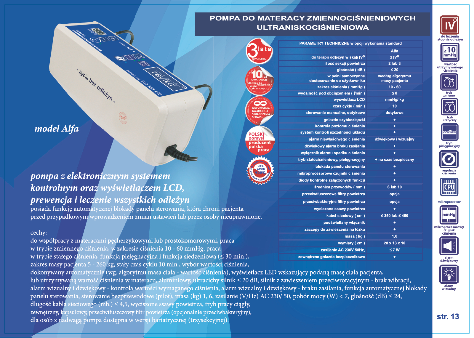 materac, model Alfabet: materac z komorami o kształcie falistym. Zaprojektowany dla osób przebywających w pozycjach „półsiedzących” (np. kardiologia, pulmonologia). Materac podwyższony z komorami w kształcie litery V, zmiennociśnieniowy do opieki długoterminowej. Wykonany z medycznego PU. Dzięki 10 cm wysokości materac znacznie redukuje siły ucisku ciała leżącej na nim osoby. Materac należy układać na elastycznych podkładach (np. materacach gąbkowych). Zapewnia zwiększoną stabilność i komfort choremu oraz zapobiega jego zsuwaniu się w dół łóżka. Długość komór w części zmiennociśnieniowej jest około 10% większa od szerokości materaca dzięki temu materac zapewnia zwiększoną redukcję sił tarcia i poprzecznie tnących. Wymiary 196 x 85 x 10 cm, 16 komór poprzecznych, wyłogi stabilizujące, pokrowiec membraMED®, szybkozłączka transportowa. Zdjęcie przedstawia dodatkowy materac spodni.