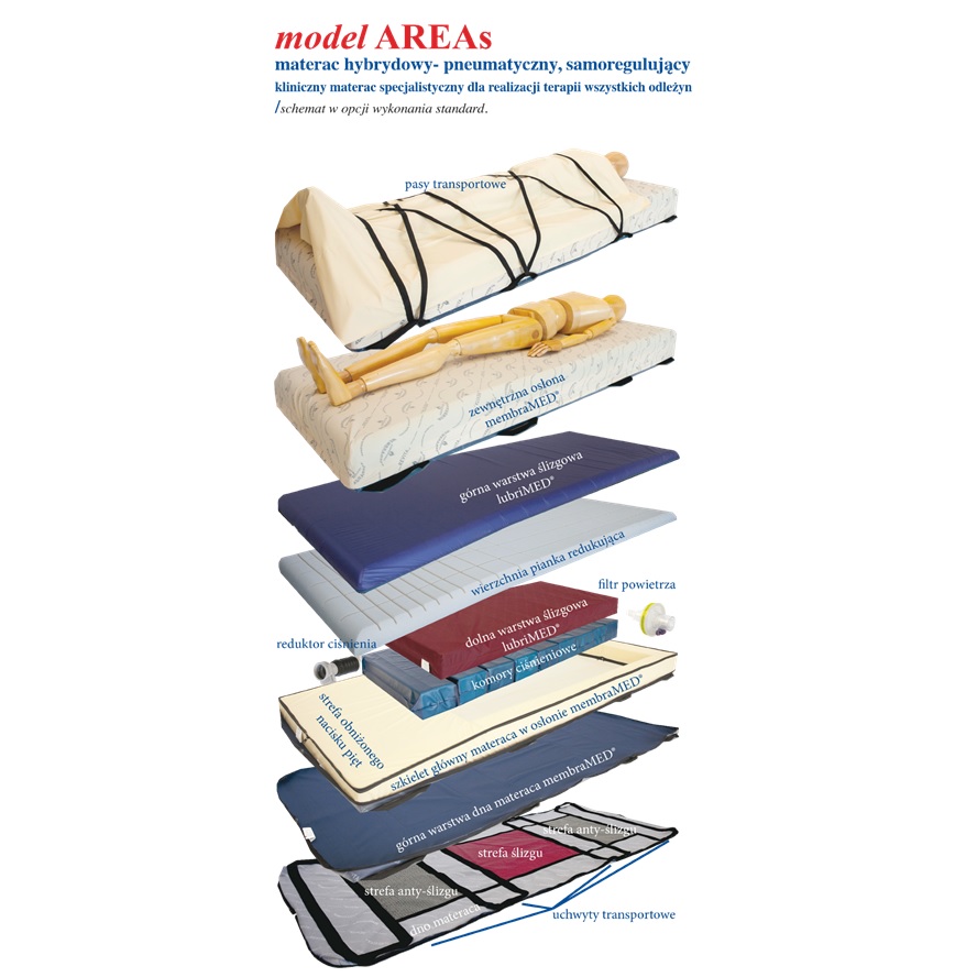 Optymalnie dopasowane ciśnienie jest utrzymywane przez cały okres terapii bez względu na pozycję pacjenta, jego masę, kształt czy wzrost. Dzięki zredukowaniu wartości ciśnienia (ucisku) na powierzchni stycznej ciała pacjenta jest zminimalizowana wartość kumulujących się sił wewnątrztkankowych. AREAs jest materacem przeznaczonym do terapii wszystkich odleżyn.