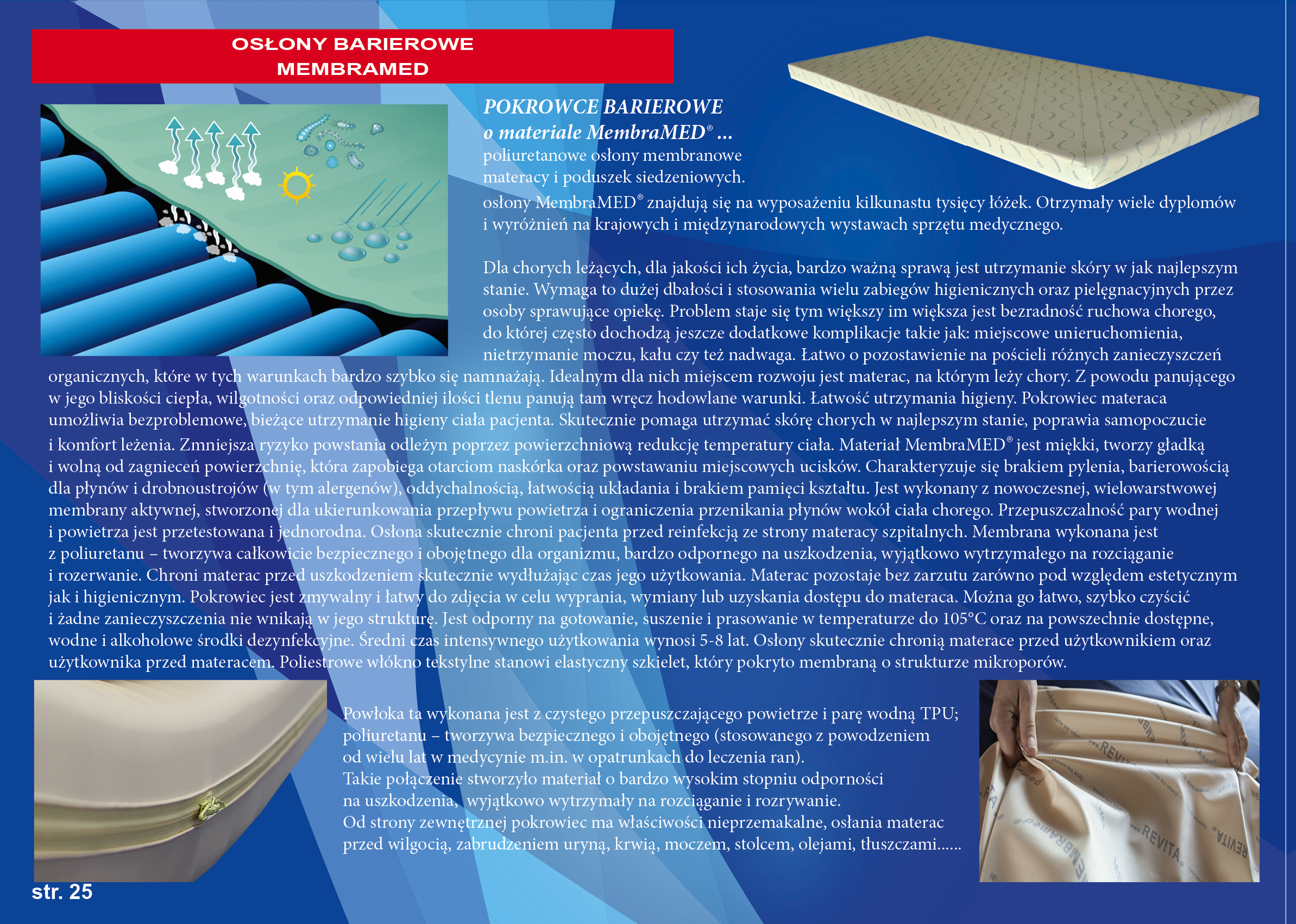 Pokrowce barierowe, poliuretanowe osłony membranowe materacy i poduszek siedzeniowych. Osłony MembraMED® znajdują się na wyposażeniu kilkunastu tysięcy łóżek. Otrzymały wiele dyplomów i wyróżnień na krajowych i międzynarodowych wystawach sprzętu medycznego.