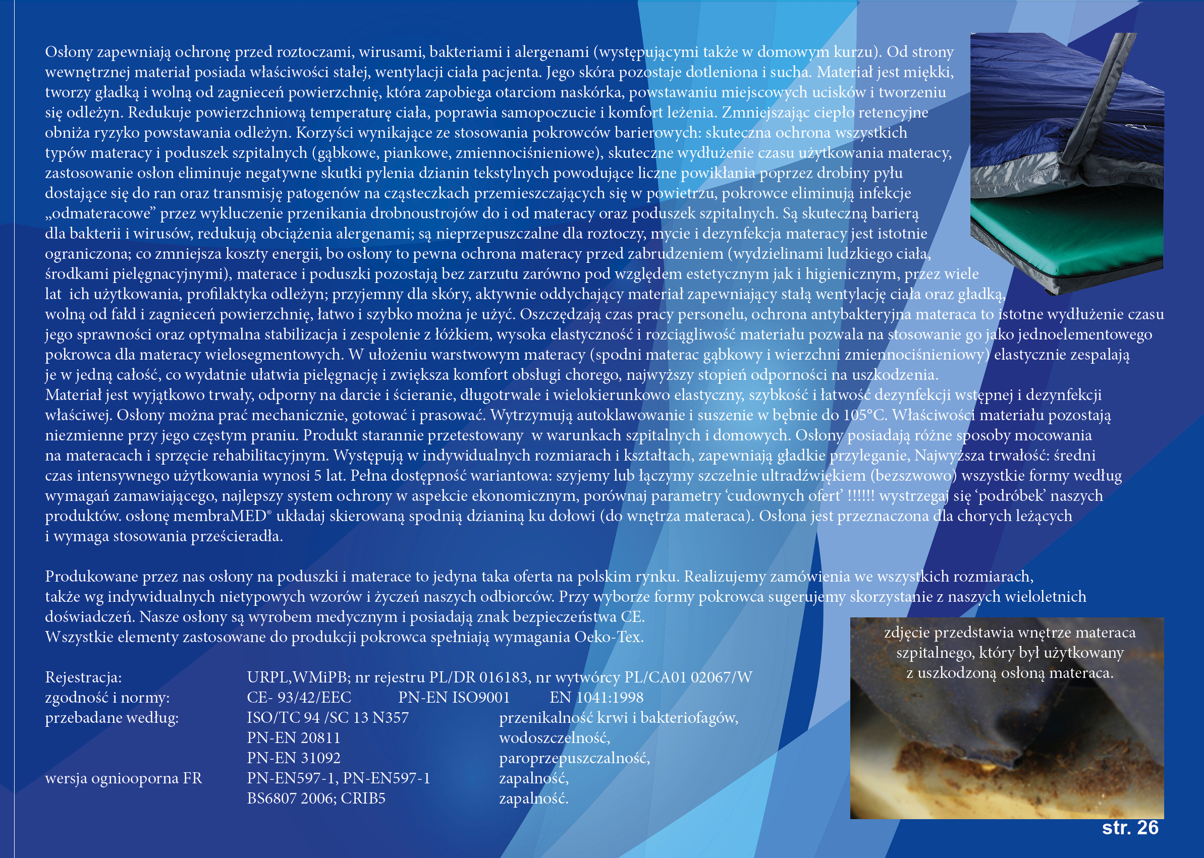 Osłony zapewniają ochronę przed roztoczami, wirusami, bakteriami i alergenami (występującymi także w domowym kurzu). Od strony wewnętrznej materiał posiada właściwości stałej, wentylacji ciała pacjenta. Jego skóra pozostaje dotleniona i sucha. Materiał jest miękki, tworzy gładką i wolną od zagnieceń powierzchnię, która zapobiega otarciom naskórka, powstawaniu miejscowych ucisków i tworzeniu się odleżyn. Redukuje powierzchniową temperaturę ciała, poprawia samopoczucie i komfort leżenia. Zmniejszając ciepło retencyjne obniża ryzyko powstawania odleżyn. Korzyści wynikające ze stosowania pokrowców barierowych: skuteczna ochrona wszystkich typów materacy i poduszek szpitalnych (gąbkowe, piankowe, zmiennociśnieniowe), skuteczne wydłużenie czasu użytkowania materacy, zastosowanie osłon eliminuje negatywne skutki pylenia dzianin tekstylnych powodujące liczne powikłania poprzez drobiny pyłu dostające się do ran oraz transmisję patogenów na cząsteczkach przemieszczających się w powietrzu, pokrowce eliminują infekcje „odmateracowe” przez wykluczenie przenikania drobnoustrojów do i od materacy oraz poduszek szpitalnych. Są skuteczną barierą dla bakterii i wirusów, redukują obciążenia alergenami; są nieprzepuszczalne dla roztoczy, mycie i dezynfekcja materacy jest istotnie ograniczona; co zmniejsza koszty energii, bo osłony to pewna ochrona materacy przed zabrudzeniem (wydzielinami ludzkiego ciała, środkami pielęgnacyjnymi), materace i poduszki pozostają bez zarzutu zarówno pod względem estetycznym jak i higienicznym, przez wiele lat ich użytkowania, profilaktyka odleżyn; przyjemny dla skóry, aktywnie oddychający materiał zapewniający stałą wentylację ciała oraz gładką, wolną od fałd i zagnieceń powierzchnię, łatwo i szybko można je użyć. Oszczędzają czas pracy personelu, ochrona antybakteryjna materaca to istotne wydłużenie czasu jego sprawności oraz optymalna stabilizacja i zespolenie z łóżkiem, wysoka elastyczność i rozciągliwość materiału pozwala na stosowanie go jako jednoelementowego pokrowca dla materacy wielosegmentowych. W ułożeniu warstwowym materacy (spodni materac gąbkowy i wierzchni zmiennociśnieniowy) elastycznie zespalają je w jedną całość, co wydatnie ułatwia pielęgnację i zwiększa komfort obsługi chorego, najwyższy stopień odporności na uszkodzenia. Materiał jest wyjątkowo trwały, odporny na darcie i ścieranie, długotrwale i wielokierunkowo elastyczny, szybkość i łatwość dezynfekcji wstępnej i dezynfekcji właściwej. Osłony można prać mechanicznie, gotować i prasować. Wytrzymują autoklawowanie i suszenie w bębnie do 105°C. Właściwości materiału pozostają niezmienne przy jego częstym praniu. Produkt starannie przetestowany w warunkach szpitalnych i domowych. Osłony posiadają różne sposoby mocowania na materacach i sprzęcie rehabilitacyjnym. Występują w indywidualnych rozmiarach i kształtach, zapewniają gładkie przyleganie, Najwyższa trwałość: średni czas intensywnego użytkowania wynosi 5 lat. Pełna dostępność wariantowa: szyjemy lub łączymy szczelnie ultradźwiękiem (bezszwowo) wszystkie formy według wymagań zamawiającego, najlepszy system ochrony w aspekcie ekonomicznym, porównaj parametry ‘cudownych ofert’ !!!!!! wystrzegaj się ‘podróbek’ naszych produktów. osłonę membraMED® układaj skierowaną spodnią dzianiną ku dołowi (do wnętrza materaca). Osłona jest przeznaczona dla chorych leżących i wymaga stosowania prześcieradła.