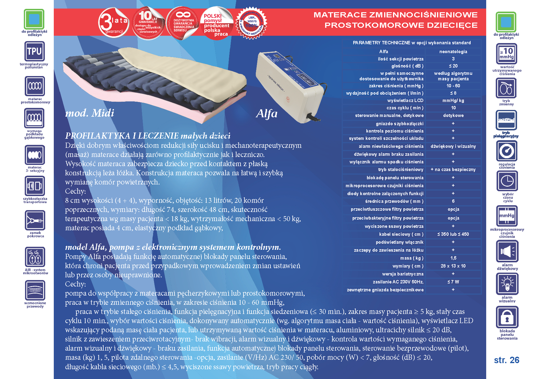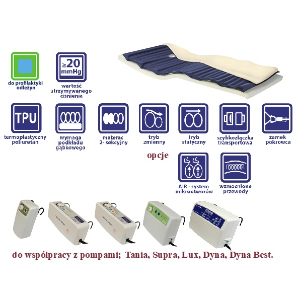 Profilaktyka i leczenie noworodków i niemowląt, to najmniejszy z produkowanych przez nas materacy. Dzięki dobrym właściwościom redukcji siły ucisku i mechanoterapeutycznym (masaż) materace działają zarówno profilaktycznie, jak i leczniczo. Wysokość materaca zabezpiecza dziecko przed kontaktem z konstrukcją leża łóżka. Do transportu może być zasilany bateryjnie przez pompę Ola.