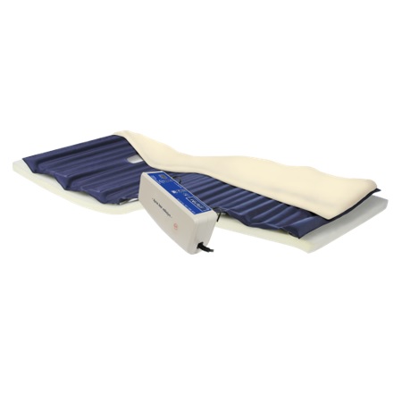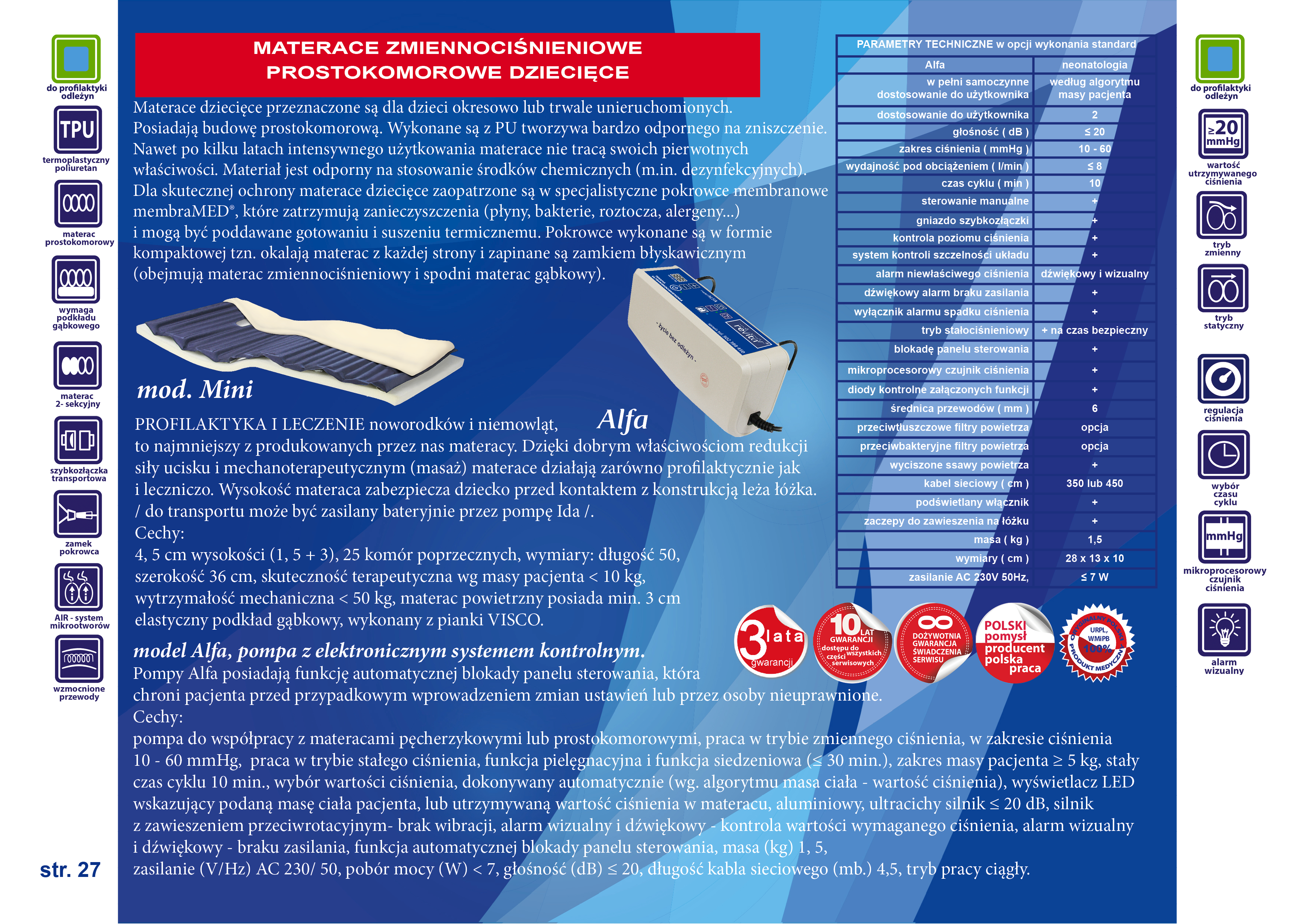 Pompa, model Alfa: ultraniskociśnieniowa, jednosilnikowa pompa z regulacją cyfrową, systemem kontrolnym, wyświetlacz LED. Pompa posiada wybór wartości ciśnienia, dokonywany automatycznie (wg. algorytmu masa ciała – wartość ciśnienia), wyświetlacz LED wskazujący podaną masę ciała pacjenta lub aktualnie utrzymywaną wartość ciśnienia w materacu. Funkcję automatycznej blokady panelu sterowania, która chroni pacjenta przed przypadkowym wprowadzeniem zmian ustawień lub przez osoby nieuprawnione. W pompach można załączyć i wyłączyć blokadę panelu sterowania. Panel sterowania – dotykowy. Alarm wizualny i dźwiękowy – wartości ciśnienia i braku zasilania, diody kontrolne załączonych funkcji. Zakres ciśnienia 10- 60 mmHg. Nastawy i regulacje oraz zmiany wartości ciśnienia dokonujemy na panelu dotykowym sterowania pompy. Tryb pielęgnacyjny, z zabezpieczeniem czasowym. Układ kontroli prawidłowego ciśnienia. Wyciszona ssawa powietrza, aluminiowy, bardzo cichy silnik ≤ 20 dB, silnik z zawieszeniem przeciwrotacyjnym – brak wibracji, zaczepy do zawieszenia na łóżku.