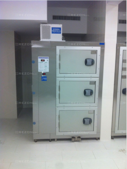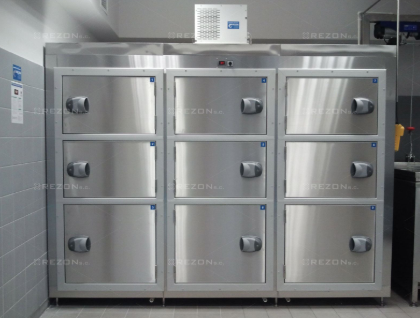 Płat drzwi wyposażony jest w zamek z wkładką patentową z funkcją bezpiecznego otwierania od wewnątrz. Przechowywanie zwłok odbywa się na specjalnych tacach wsuwanych na wielopoziomowy regał umieszczony w komorze. Zastosowane nowoczesne, energooszczędne urządzenie chłodnicze gwarantuje automatyczne utrzymanie żądanej temperatury w zakresie -5oC do +5oC, czynnik chłodniczy spełnia wymogi odpowiedniej konwencji jakościowej.