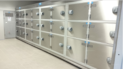 - Nowoczesny regałowy system przechowywania ciał – układ wielopoziomowych regałów oraz tac ram pod trumny wykonanych z wysokogatunkowej stali nierdzewnej – kwasoodpornej potwierdzonej certyfikatami jakości