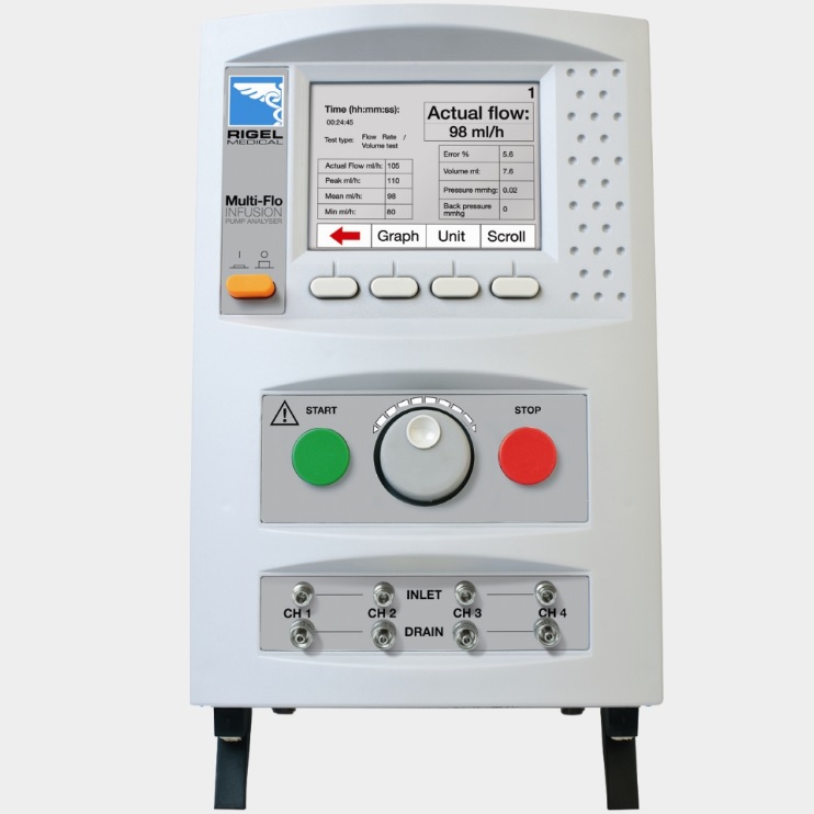 RIGEL MULTI-FLO to chyba najszybszy na rynku analizator pomp infuzyjnych o tak dużej dokładności pomiaru. To przenośne urządzenie umożliwia pełną i szybką diagnostykę parametrów funkcjonalnych wszystkich rodzajów pomp infuzyjnych i do tego automatycznie interpretuje wynik testu. Oferowany jest do wyboru w wersji 1,2 lub 4 kanałowej co oznacza ilość jednocześnie i niezależnie testowanych pomp. Dzięki swoim najnowocześniejszym rozwiązaniom technologicznym staje się wymarzonym i praktycznym narzędziem dla inżynierów medycznych. Dodatkowymi zaletami jest duży, czytelny, kolorowy wyświetlacz obrazujący aktualne wartości pomiarowe, pamięć danych, wielojęzyczne, w tym polskie menu oraz komunikacja zarówno poprzez Bluetooth jak i złącze USB. Innowacyjna funkcja tworzenia wykresu pracy pompy w czasie rzeczywistym daje pełną informację o stanie badanego urządzenia. Jeszcze nigdy testowanie pomp infuzyjnych nie było tak proste, szybkie, dokładne oraz w pełni zgodne z wymaganiami normy IEC PN EN 60601-2-24. Możliwa jest również zdalna kontrola analizatora Rigel Multi-Flo poprzez opcjonalne oprogramowanie Med-eBase. Co najciekawsze dla testerów jedno i dwukanałowe możesz w każdej chwili dodać kolejny kanał pomiarowy aż do czterech.