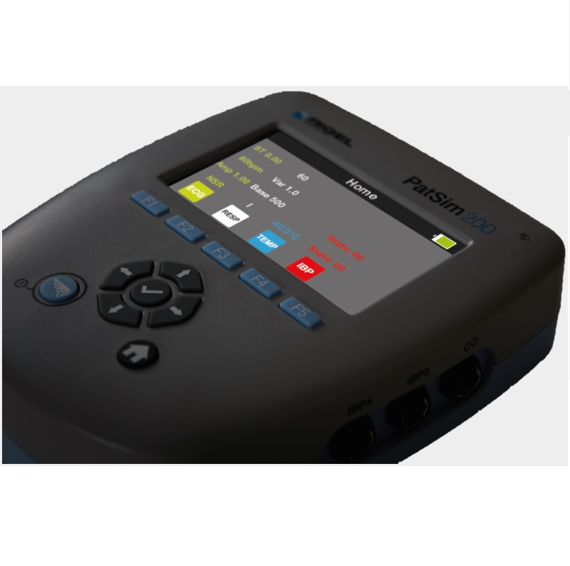 RIGEL PATSIM 200 to niewielki symulator EKG, IBP (ciśnienia inwazyjnego), temperatury i oddechu. Stworzony do błyskawicznych testów. Inaczej niż inne symulatory posiada przycisk przywołania najczęściej używanych symulacji. Koniec z mozolnym poszukiwaniem właściwej funkcji. Jedną z bardziej unikalnych funkcji jest możliwość zapisania w pamięci do 5 najczęściej stosowanych symulacji i szybkiego ich wywołania. Wystarczą 3 kliknięcia. Symulator sam w sobie jest kompaktowy, lekki i wyposażony w duży kolorowy wyświetlacz o wysokim kontraście i niskiej luminancji co daje doskonały odczyt nawet przy słabym oświetleniu. Do tych wszystkich zalet dodamy jeszcze standardowe adaptery EKG dołączone do symulatora i złącza DIN dzięki czemu zamiana Twojego aktualnego symulatora na Rigel PatSim 200 nie pociągnie za sobą dodatkowych kosztów. Nasz symulator jest zgodny z większością przewodów do symulacji IBP i temperatury, które już masz.