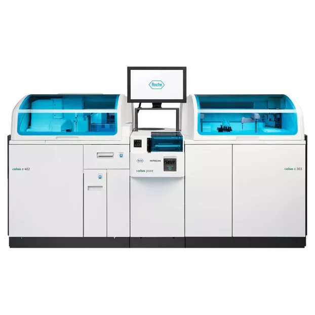 Modułowy system zintegrowany najnowszej generacji. Skonsolidowane badania z zakresu chemii klinicznej i immunochemii. Przeznaczony dla małych i średnich laboratoriów. Umożliwia wykonywanie > 95% rutynowych badań biochemicznych i immunochemicznych. Inteligentne zarządzanie transportem badanego materiału. Możliwość zlecania próbek pilnych w trakcie pracy. Możliwość automatycznego rozcieńczania próbek. Zalety systemu: Dostosowany do pracy jako system zintegrowany <c303|e402> lub jako pojedyńcze, wolnostojące analizatory: biochemiczny cobas c303 lub immunochemiczny cobas e402; Prowadzenie bieżącej i skumulowanej kontrola jakości; Szerokie menu parametrów rutynowych i specjalistycznych zintegrowanych w jednym systemie. Najwyższa jakość wyników, zabezpieczenia przed kontaminacją i błędem carry-over.