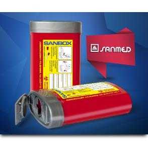 SANBOX to innowacyjny osobisty pojemnik na zużyte igły. Wyrób ten kierowany jest przede wszystkim do użytkowników, którzy szukają optymalnego rozwiązania dla gromadzenia igieł nie tylko w jednostce służby zdrowia ale również w terenie. Ze względu na kompaktowe wymiary szczególnie nadaje sie do stosowania przez pielęgniarki środowiskowe jako osobisty pojemnik noszony w torbach zabiegowych. SANBOX ma ergonomiczny kształt umożliwiający wygodne trzymanie pojemnika w dłoni i jego obsługę. Pokrywka pojemnika to nowoczesny system zamykania chwilowego i ostatecznego. Wygodna i prosta w obsłudze klapka po otwarciu daje dostęp do otworu wrzutowego. Otwór pojemnika wyposażony jest w wygodny zaczep umożliwiający rozdzielenie igły od strzykawki bez konieczności dotykania igły ręką. Zabezpiecza to użytkownika przed niezwykle groźnym ryzykiem zakłucia. Po odhaczeniu igły jednym ruchem ręki pojemnik można zamknąć aż do kolejnego użycia i bezpiecznie transportować nawet w torbie pielęgniarki. Po napełnieniu pojemnika lub przekroczeniu czasu jego użytkowania końcową część klapki pojemnika należy odgiąć ku górze i zamknąć bezpowrotnie pojemnik. Zamknięcie to jest jednocześnie plombą świadczącą o ostatecznym zużyciu pojemnika i konieczności jego utylizacji. Pojemnik oznakowany jest w czytelną etykietą z wymaganymi polami do opisu oraz obrazkową instrukcją obsługi uławiającą obsługę.