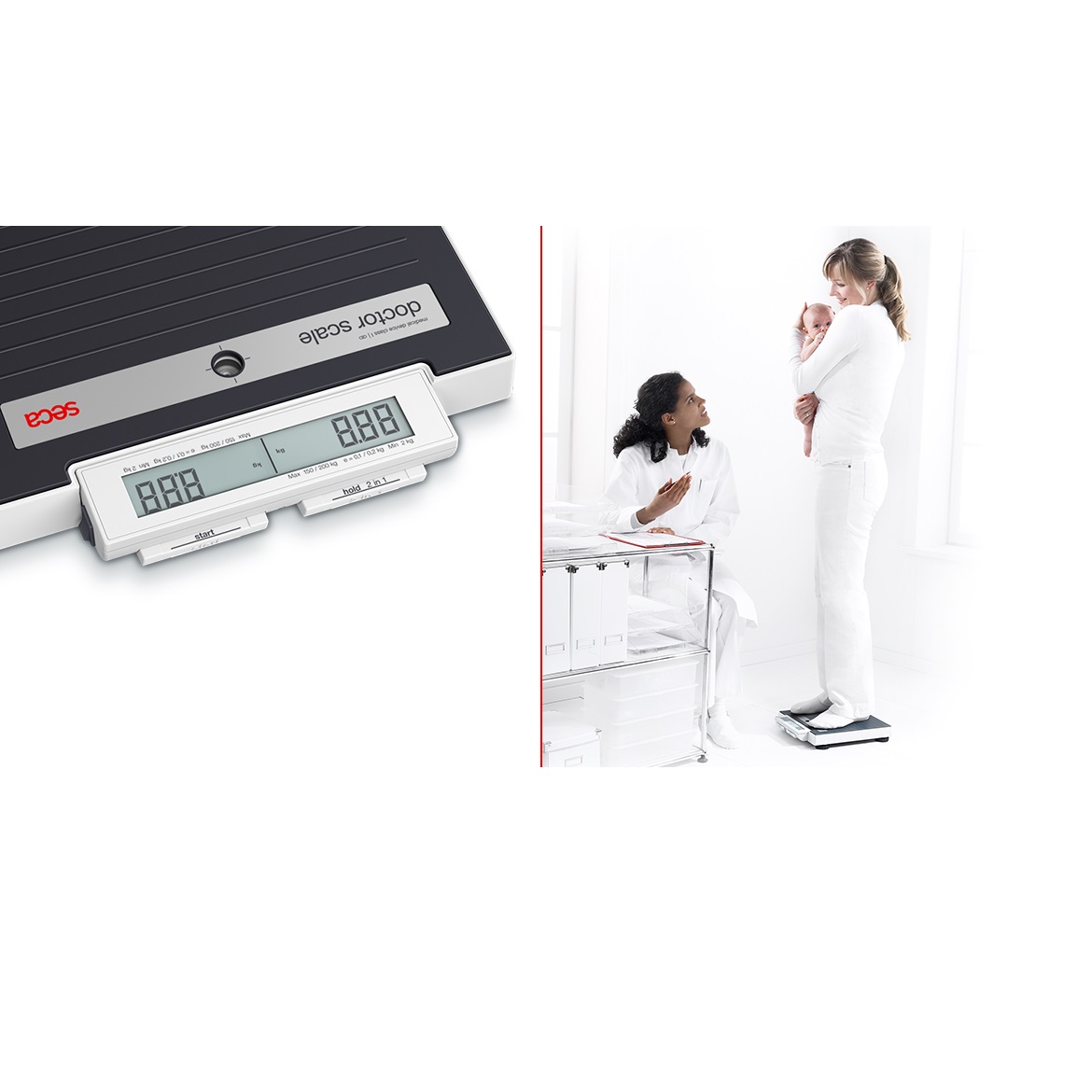 Monitowanie i odczyt zmierzonych wartości z dwóch różnych pozycji oferuje podwójny wyświetlacz LCD. Funkcjonalność produktu gwarantuje również możliwość obsługi wagi stopą, poprzez dwa przyciski umieszczone w przedniej części wyświetlacza. Bezstresowe ważenie niemowląt za pomocą funkcji matka/ dziecko. Połączenie tych funkcji z kompaktowym i nowoczesny design sprawiają, że seca 878 dr jest idealną wagą dla każdego lekarza.