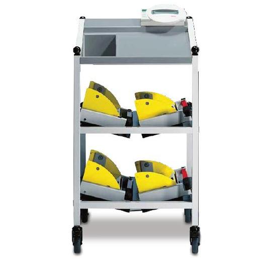 Stabilny wózek na sprzęt ułatwia transportowanie całkowitej wagi seca 985. Górna półka, oferuje miejsce na wielofunkcyjny wyświetlacz, osobny schowek oraz podkładkę na kartoteki lub dokumenty diagnostyczne. W przegrodach poniżej można bezpiecznie przetransportować cztery ogniwa obciążnikowe do ich miejsca zastosowania.
