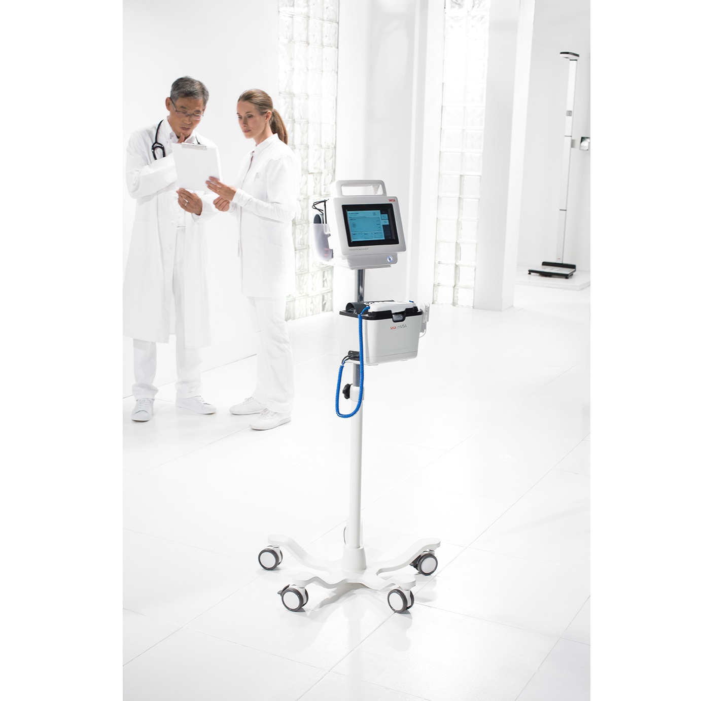 Aparat seca mVSA 535 to pierwszy na świecie monitor typu „spot-check”, łączący możliwość pomiaru parametrów życiowych oraz prowadzenia analizy impedancji bioelektrycznej (BIA). W jednym etapie pozwala ocenić cztery parametry życiowe: ciśnienie tętnicze, SpO2, tętno, temperatura) oraz oznaczyć skład ciała (zawartość wody w organizmie, masa tkanki tłuszczowej, masa tkanki mięśniowej). W trakcie rutynowej kontroli pozwala zmierzyć więcej parametrów oraz poprawić Państwa możliwości diagnostyczne i terapeutyczne poprzez skojarzone przedstawienie wyników analizy BIA i parametrów życiowych. Wydajne oprogramowanie łączy się z każdą siecią i zapewnia bezbłędne przekazanie wyników pomiarowych do stosowanego przez Państwa systemu elektronicznej dokumentacji medycznej. W razie potrzeby nasza usługa integracyjna pomoże zintegrować system z Państwa strukturą informatyczną, co pozwoli zoptymalizować proces rutynowych pomiarów wykonywanych każdego dnia. Aparat seca mVSA należy do serii produktów bezprzewodowych seca 360° wireless i zapewnia automatyczne przekazywanie informacji dotyczących wzrostu i masy ciała z kompatybilnych wag i systemów pomiarów długości (wysokości) ciała do urządzenia. Aparat automatycznie wylicza wartość wskaźnika BMI.