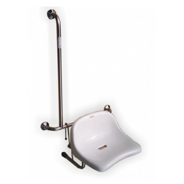Siodełko montowane do ściany wraz z pionową poręczą 60 cm ze stali nierdzewnej. Doskonale nadaje się do kabin prysznicowych. Siedzisko posiada atesty i deklaracje medyczne CE dlatego z powodzeniem może być wykorzystywane w szpitalach lub domach opieki.