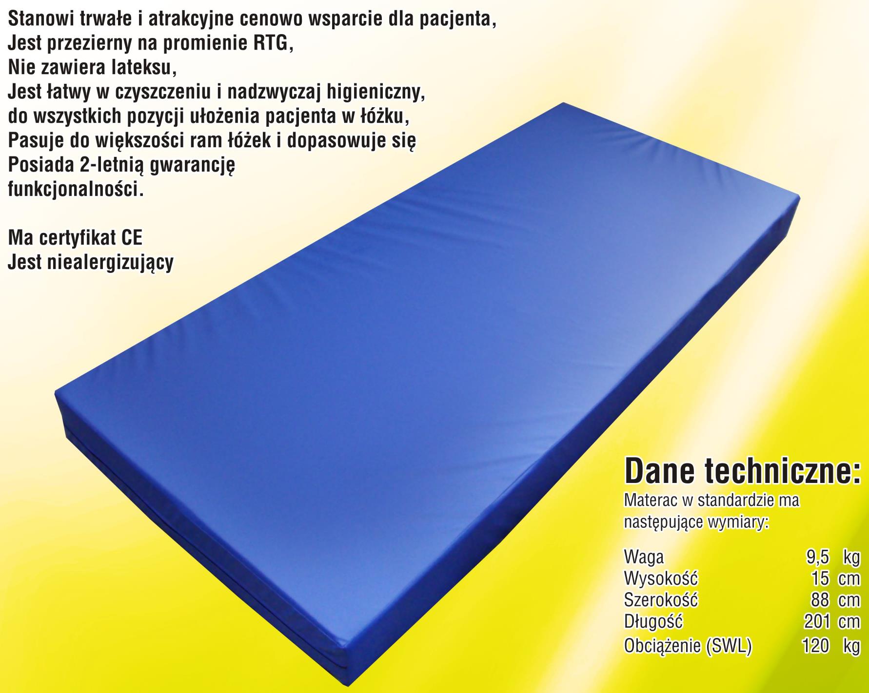Materac MS Standard składa się z jednorodnej pianki poliuretanowej o wysokiej gęstości (T-35 kg/m3) i zapewnia pacjentowi pełną wygodę. Materac zaopatrzony jest w wodoszczelny, paroprzepuszczalny pokrowiec z tkaniny SANWIL C 460 o właściwościach nietoksycznych, łatwy do czyszczenia i dezynfekcji, zapewniający pacjentom i ich opiekunom maksimum higieny (opcjonalnie niepalny oraz podklejane szwy). Posiada zamek błyskawiczny na 3 bokach (2 krótkie i 1 długi).