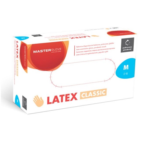 Rękawice diagnostyczne Master Glove Latex Classic. Rękawice są pudrowane, jednorazowe, niesterylne, kolor naturalny.