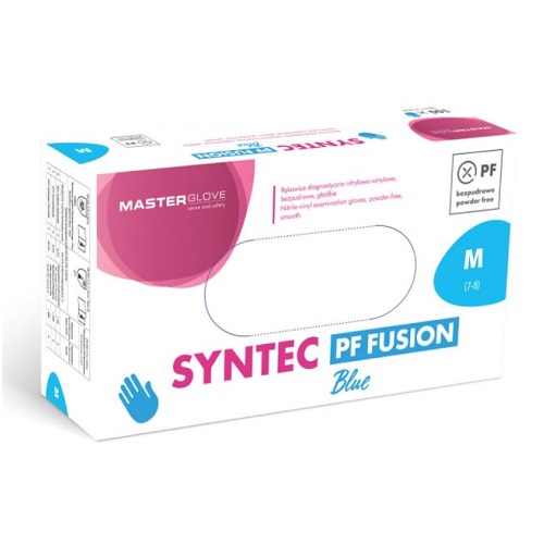 Rękawice diagnostyczne medyczne syntetyczne (wykonane z nitrylu oraz winylu) Master Glove Syntec PF Fusion Blue. Rękawice medyczne są bezpudre, rękawice niesterylne, jednorazowe, kolor - niebieski.