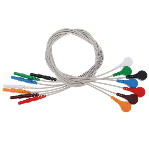 12. Komplet (5 szt) przewódów dołączeniowych do kabli KM. Przewody o długości 60 cm, charakteryzują się zakończoniem od strony elektrod EKG klamrami (M), od strony kabla głównego gniazdami DIN o średnicy 1,5 mm.