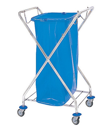 Wózek na odpady. Wyposażenie standardowe:1. konstrukcja wózka chromowana KONS-0021, 2. worek 120 l niebieski WORE-0002, 3. 5 x zapinka worka ZAPI-0001. 1szt./1 paczka (650x150x1200 mm). Waga: netto - 7,8 kg, brutto -8,6 kg. 10 szt./1 paleta (800x1200 mm).