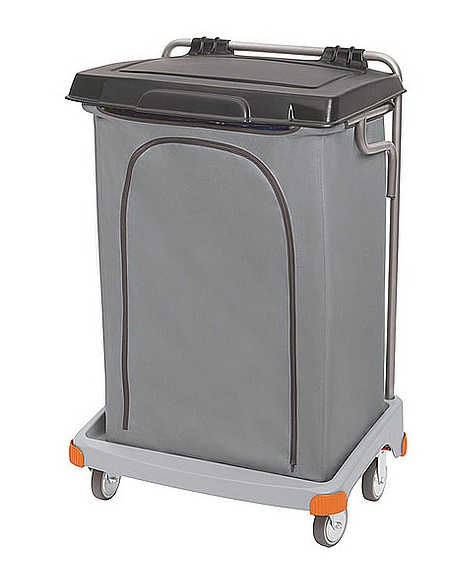 Pojedynczy wózek na odpady z tworzywa sztucznego. Wyposażenie standardowe: 1. podstawa L TS PODS-0019, 2. 2 x odbojnik zestawu TS ODB-0001, 3. 2 x odbojnik zestawu TS ODB-0002, 4. rurka – ramka główna RURK-0034, 5. rurka worka z podpórkami RURK-0042, 6. 2 x kółko 100 mm z płytką mocującą KOLK-0006, 7. 2 x kółko 100 mm z płytką mocującą stałe KOLK-0011, 8. 5 x zapinka worka ZAPI-0001, 9. worek 120 l niebieski WORE-0002, 10. worek osłonowy 120 l szary WORE-0031, 11. pokrywa 120 l TS czarna POKR-0084. 1szt./1 paczka (870x590x410 mm). Waga: netto - 10,7 kg, brutto - 13,1 kg. 8 szt./1 paleta (800x1200 mm).
