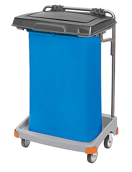 Pojedynczy wózek na odpady z tworzywa sztucznego. Wyposażenie standardowe: 1. podstawa L TS PODS-0019, 2. 2 x odbojnik zestawu TS ODB-0001, 3. 2 x odbojnik zestawu TS ODB-0002, 4. rurka – ramka główna RURK-0034, 5. rurka worka z podpórkami RURK-0042, 6. 2 x kółko 100 mm z płytką mocującą KOLK-0006, 7. 2 x kółko 100 mm z płytką mocującą stałe KOLK-0011, 8. 5 x zapinka worka ZAPI-0001,