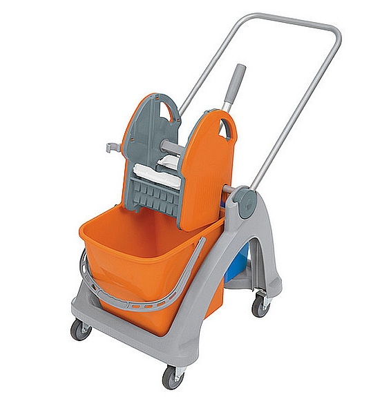 Wózek z tworzywa sztucznego pomarańczowo/niebieski. Wyposażenie standardowe: 1. konstrukcja pojedynczego wózka z tworzywa sztucznego kompletna KONS-0024, 2. rączka aluminiowa RURK-0007, 3. 2 x osłona boczna OSLO-0013, 4. prasa do wyciskania szaro/pomarańczowa PRAS-0026, 5. wiadro 25 l pomarańczowe WIAD-0030, 6. wiadro 6 l niebieskie WIAD-0004. 1 szt./1 paczka (620x470x500mm). Waga: netto - 8 kg, brutto - 9, 2 kg. 12 szt./1 paleta (800x1200 mm).