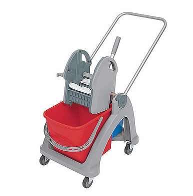 Wózek z tworzywa sztucznego czerwono/niebieski. Wyposażenie standardowe:1. konstrukcja pojedynczego wózka z tworzywa sztucznego kompletna KONS-0024, 2. rączka aluminiowa RURK-0007, 3. 2 x osłona boczna OSLO-0013, 4. prasa do wyciskania szara PRAS-0015, 5. wiadro 25 l czerwone WIAD-0026, 6. wiadro 6 l niebieskie WIAD-0004. 1 szt./1 paczka (620x470x500mm). Waga: netto - 8 kg, brutto - 9,2 kg. 12 szt./1 paleta (800x1200 mm).
