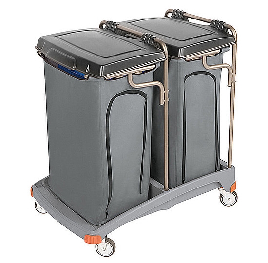Podwójny wózek na odpady z tworzywa sztucznego. Wyposażenie standardowe: 1. podstawa XL TS PODS-0020, 2. 2 x odbojnik nr 1 zestawu TS ODB-0001, 3. 2 x odbojnik nr 2 zestawu TS ODB-0002, 4. 2 x rurka – ramka główna RURK-0034, 5. 2 x rurka worka z podpórkami RURK-0042, 6. 4 x kółko 100 mm z płytką mocującą KOLK-0006, 7. 10 x zapinka worka ZAPI-0001, 8. worek 120 l niebieski WORE-0002, 9. worek 120 l czerwony WORE-0001, 10. 2 x worek osłonowy boczny 120 l szary WORE-0033, 11. 2 x pokrywa 120 l TS czarna POKR-0084. 1szt./1 paczka (1040x670x500 mm). Waga: netto - 20,2 kg, brutto - 21,8 kg. 4 szt./1 paleta (800x1200 mm).