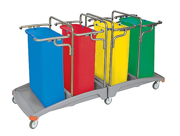 Poczwórny wózek na odpady z tworzywa sztucznego. Wyposażenie standardowe: 1. 2 x podstawa XL TS PODS-0020, 2. 2 x odbojnik nr 1 zestawu TS ODB-0001, 3. 2 x odbojnik nr 1 zestawu TS ODB-0002, 4. blacha - łącznik podstaw nr 1 BLAC-0004, 5. blacha - łącznik podstaw nr 2 BLAC-0005, 6. 4 x rurka – ramka główna RURK-0034, 7. 4 x rurka worka z podpórkami RURK-0042, 8. 6 x kółko 100 mm z płytką mocującą KOLK-0006, 9. 20 x zapinka worka ZAPI-0001, 10. worek 120 l niebieski WORE-0002, 11. worek 120 l czerwony WORE-0001, 12. worek 120 l żółty WORE-0003, 13. worek 120 l zielony WORE-0004. 1szt./1 paczka (1040x670x500 mm). Waga: netto - 32,4 kg, brutto - 35,6 kg. 2 szt./1 paleta (800x1200 mm).