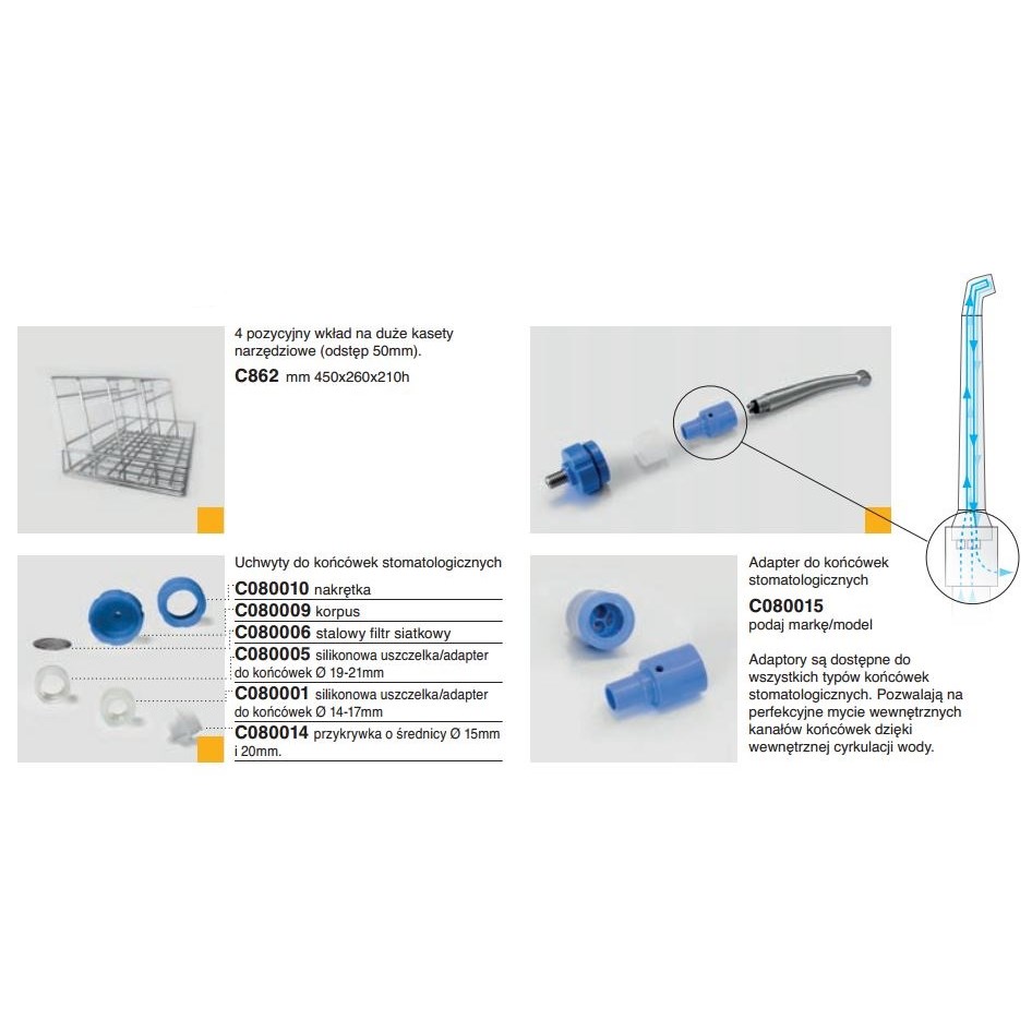 Adaptory są dostępne do wszystkich typów końcówek stomatologicznych. Pozwalają na perfekcyjne mycie wewnętrznych kanałów końcówek dzięki wewnętrznej cyrkulacji wody