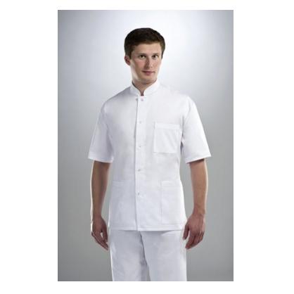 Męski fartuch medyczny ze stójką. Wyposażony w 3 kieszenie: jedna na lewej piersi, dwie na biodrach. Posiada pasek do regulacji.