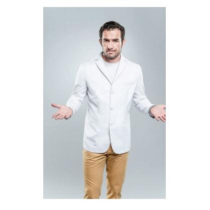 Klasyczna, męska, medyczna marynarka. Wyposażona w trzy kieszenie: jedna na lewej piersi, dwie na biodrach. Zapinana na napy lub guziki.