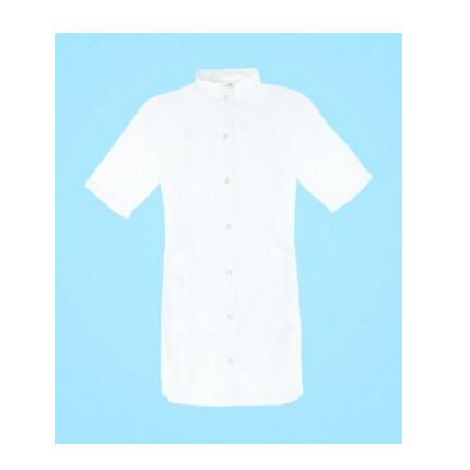 Damski, krótki fartuch medyczny. Wyposażony w dwie keszenie. Posiada krótki rękaw. Fartuch jest taliowany dzięki czemu jest dopasowany do sylwetki. Zapinany z przodu na napy. Wykończony wokół szyi stójką.