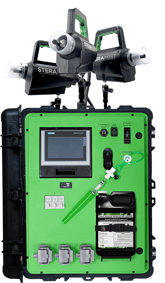 System SteraMist Environment umożliwia automatyczne zamgławianie pomieszczeń według normy EN 17272, ręczne zamgławianie trzema aplikatorami lub zbudowanie kabiny dekontaminacyjnej dla ludzi lub sprzętu. Każdy aplikator posiada 9-metrowy przewód hydrauliczno-elektryczny, wytrzymały port HartingTM, manometr i regulację ciśnienia. Intuicyjny system sterowania na bazie ekranu dotykowego i sterownika Siemens daje użytkownikom dużą swobodę w doborze parametrów zamgławiania oraz generowania i eksportowania raportów dekontaminacji.