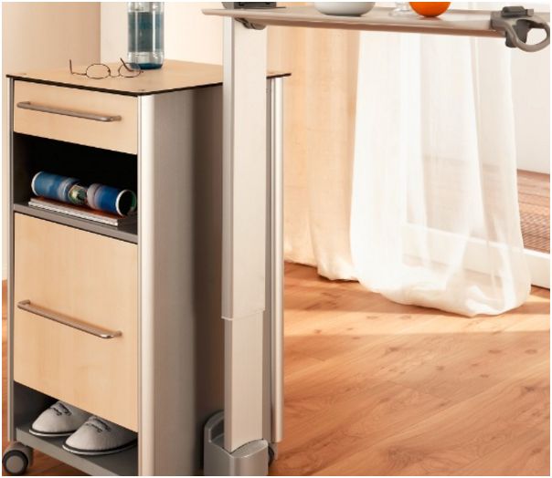 Regulacja wysokości blatu odbywa się płynnie, bezstopniowo dzięki wspomagającej sprężynie gazowej, umieszczonej w aluminiowej obudowie. Cztery podwójne koła nadające szafce dużą mobilność.