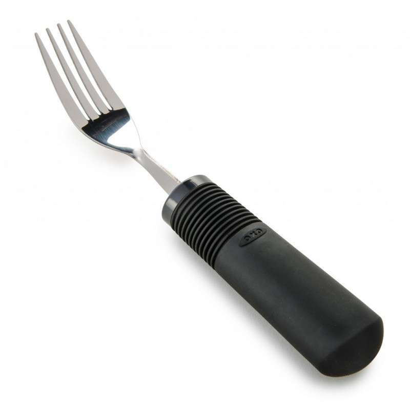 Wykonany ze stali nierdzewnej z uchwytem z czarnego tworzywa powlekanego gumą. Uchwyt ma spłaszczoną powierzchnię, co zapobiega możliwości obracania się sztućca w dłoni. Widelec można dostosować poprzez wygięcie końcówki w prawo lub w lewo. Stal z której wykonany jest widelec umożliwia wielokrotne wyginanie. Długość uchwytu 10 cm. Grubość uchwytu 30 mm.