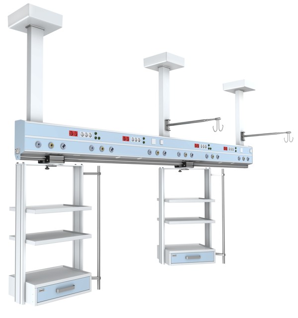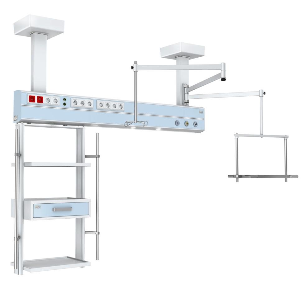 szyna instrumentalna, system szynowy ISA, wieszaki pomp infuzyjnych, wieszak teleskopowy kroplówki, półki pod aparaturę medyczną, szuflady, zestawy półkowe DEDAL