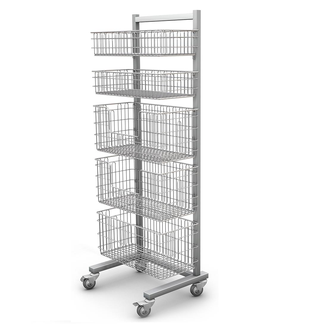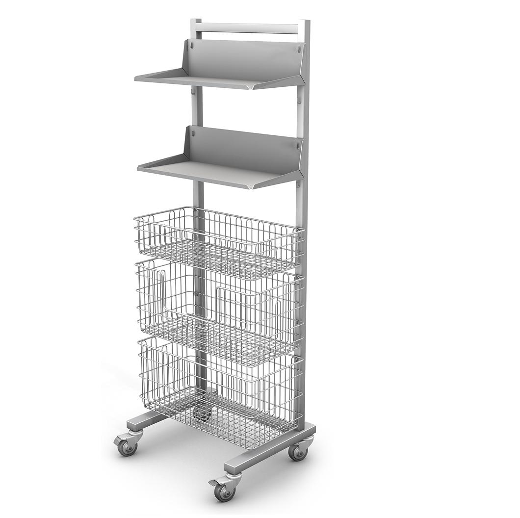 Regały RKS wykonane w całości ze stali kwasoodpornej gat. 0H18N9, wyposażone w koła o średnicy 100 mm, w tym dwa z blokadą.