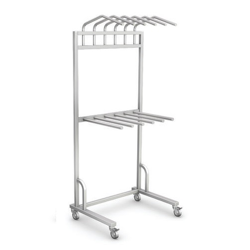 Wieszak wykonano w całości ze stali kwasoodpornej gat. 0H18N9, wyposażono w 5 ramion podstawa wyposażona w koła o średnicy 100 mm, w tym dwa z blokadą.