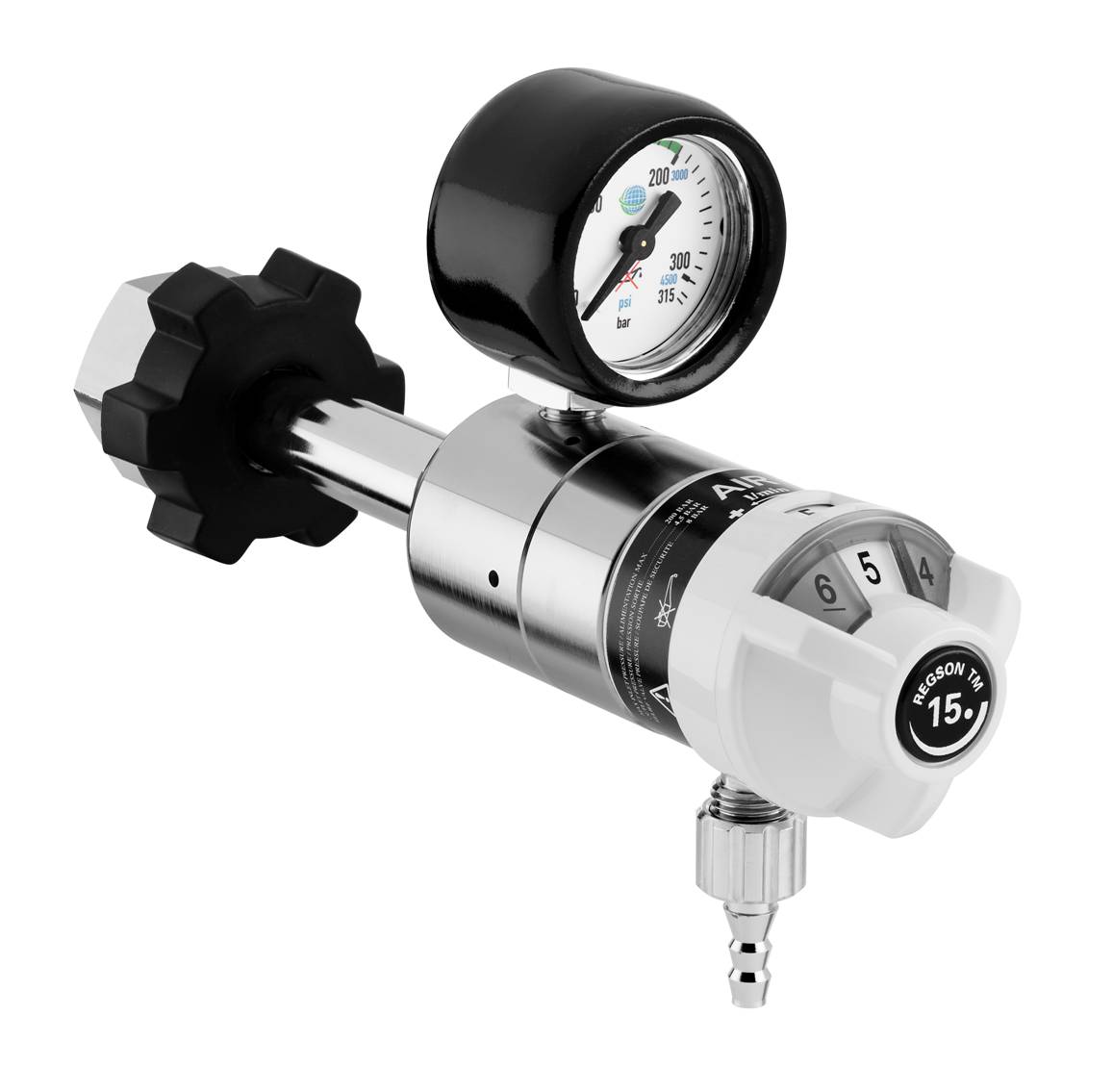 Reduktor ciśnienia na butlę z wyjściem o regulowanym skokowo przepływie z możliwością podłączenia nawilżacza.