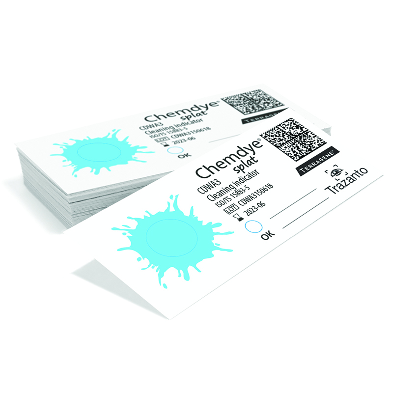 Wskaźniki Chemdye® Splat składają się z syntetycznego nośnika, który jest stabilny w temperaturach dezynfekcji. Każdy wskaźnik zawiera mieszaninę specjalnie połączonych kolorowych składników organicznych. Formuła wskaźników Splat umożliwia wykrycie wszystkich czynników, które mają wpływ na wynik procesu czyszczenia/mycia. Wskaźniki Splat mogą być stosowane do rutynowego monitorowania procesów czyszczenia/mycia w myjniach o różnych konfiguracjach mycia i dezynfekcji termicznej, a także w myjkach ultradźwiękowych.