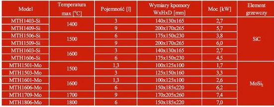 - opcje temperaturowe: 1100 stopni C, 1200 stopni C, 1300 stopni C, 1400 stopni C, 1500 stopni C, 1600 stopni C, 1700 stopni C
