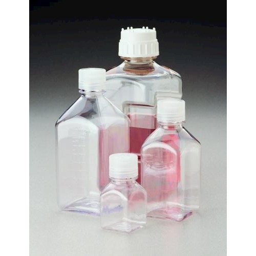 Butle z PC ze szczelną zakrywką z PP, z wypukłą podziałką i pierścieniem wlewowym. Możliwość sterylizacji w autoklawie. Idealne do przechowywania roztworów wodnych oraz krótkotrwałego przechowywania pożywek mikrobiologicznych.