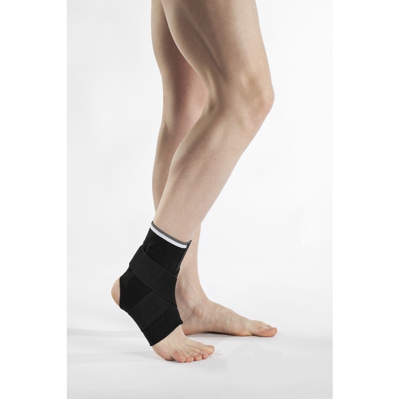 Orteza stabilizująca staw skokowy z wzmocnieniami wykonana z elastycznego materiału posiadającego bardzo dobre właściwości w zakresie przepuszczalności powietrza i odprowadzania wilgoci. Zastosowanie lekkich, obocznych wzmocnień obejmujących kostki pozwala na zabezpieczenie niestabilności stawu w kierunkach bocznym i przyśrodkowym, a dodatkowe taśmy zabezpieczają przed przesunięciem i skręceniem kości skokowej. Orteza typu otwartego pięta-palce zapewnia wysoki komfort użytkowania.